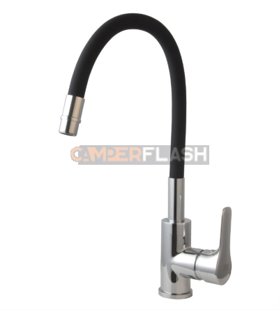 Mitigeur d'évier pour camping-car avec bec flexible, pratique et fonctionnel. Cadre en laiton chromé avec finition noire, résistant et durable.